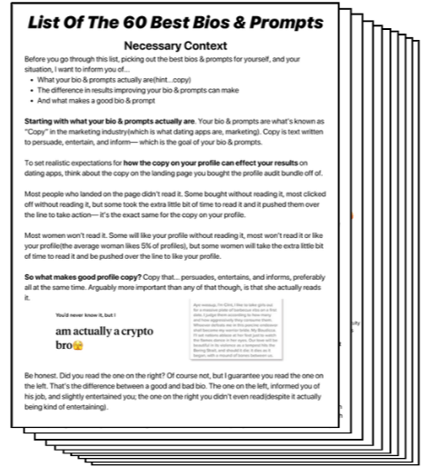 You’ll get my private vault of 60 bios and prompts that consistently attract high-quality women.