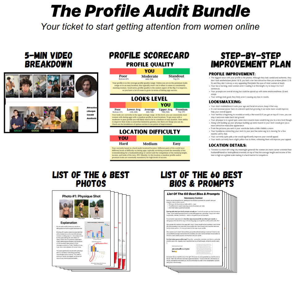 The Profile Audit Bundle is specifically designed for single men, aged 20-45, who know they have value to bring to a relationship with a woman, but aren't currently getting the results they want on dating apps.Â